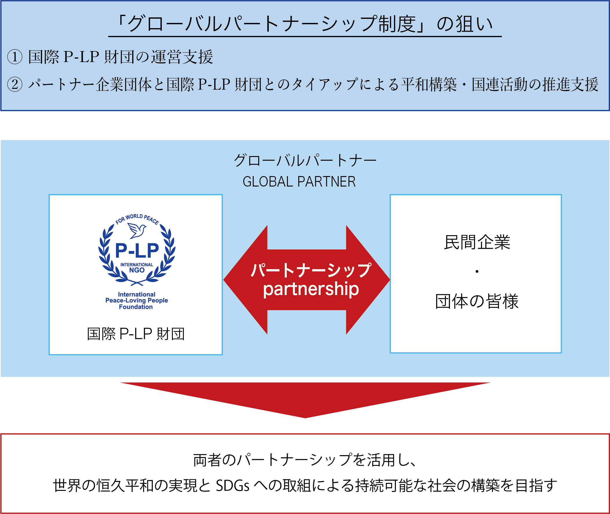 国際P-LP財団では、世界の恒久平和の実現とSDGsへの取組による持続可能な社会の構築を目指し、民間企業・団体の皆様とのパートナーシップによる取組を推進する「グローバルパートナーシップ制度」を設けています。グローバルパートナーの皆さまには、国際P-LP財団の運営をご支援いただくほか、当財団とのタイアップによる各種活動を行っていただきます。